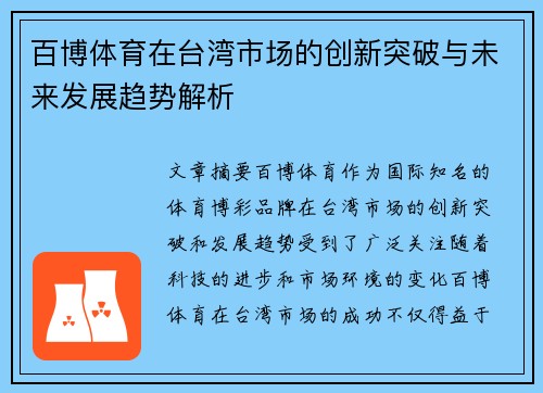 百博体育作为国际知名的体育博彩品牌,在台湾市场的创新突破和发展趋势受到了广泛关注。随着科技的进步和市场环境的变化,百博体育在台湾市场的成功不仅得益于其领先的技术创新,还在于其深入了解台湾市场的文化特性与消费者需求。在未来的发展中,百博体育将继续优化其产品和服务,拓展用户群体,提升品牌价值。本文将从四个方面详细探讨百博体育在台湾市场的创新突破,包括技术创新、产品本地化、用户体验提升以及市场扩展策略,分析这些因素如何推动其在台湾市场的快速发展,并展望未来的趋势与挑战。